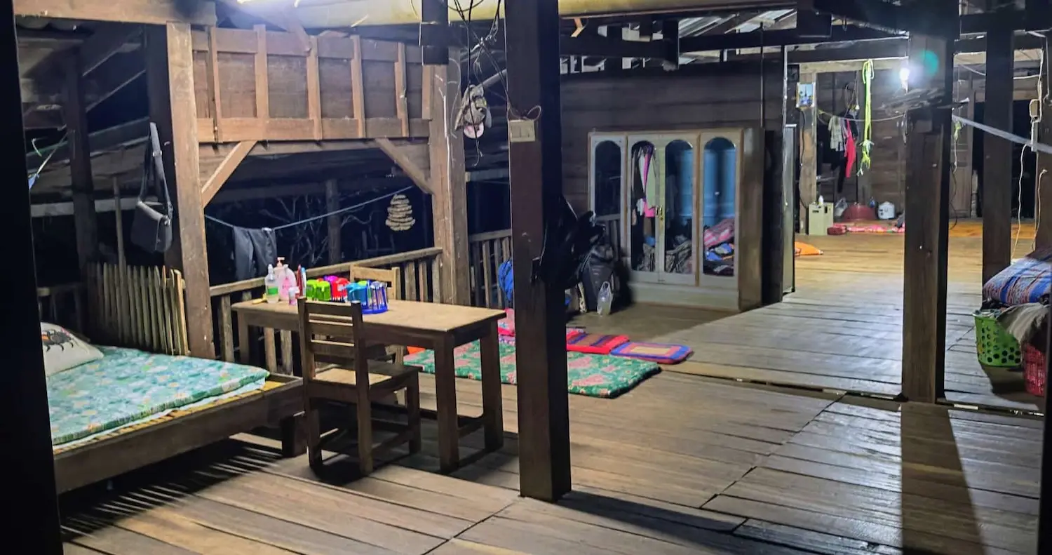 Das Haus ist ein traditionelles laotisches Holzhaus auf Stelzen. Nachts hörst du vor allem die Geräusche der Natur. Statt Stadtlichtern erwartet dich ein klarer Sternenhimmel ohne Lichtverschmutzung mitten im abgelegenen Laos.